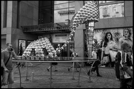 UKRAINE. Dnipropetrovsk. Statue of a high heel shoe made of pans....