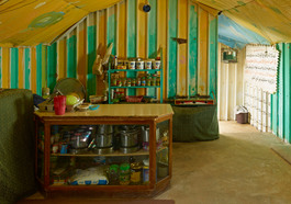Jordan. Azraq Syrian Refugee Camp. Hut owned by a Syrian artist...