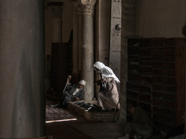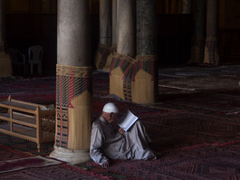 TUNISIA. Kairouan. 2015. A man reads the Quran inside the Great...
