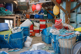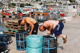 GB. England. Cornwall. Newlyn Harbour. Preparing Lobster pots....