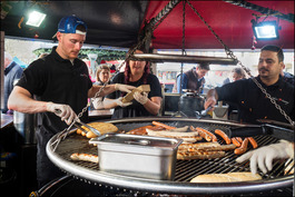 GB. England. Wiltshire. Salisbury. A German Bratwurst stall...