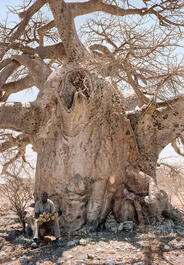 BOTSWANA. 2018. Super Sande, a local Botswanan guide, holds baobab...