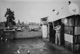 TURKEY. Adana. 2018. A man shakes a stick to fly his birds in...