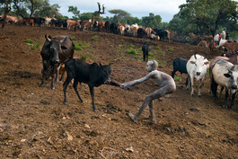ETHIOPIA. Surma Tribe, Omo Valley, 2013. Boy milking cow.