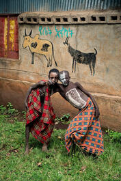 ETHIOPIA. Omo Valley, 2013. Two boys stand next to a painted...