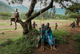 ETHIOPIA. Suri Tribe, Omo Vallery. 2013. Two boys lean on eachother.
