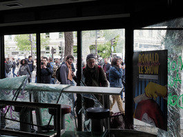 FRANCE. Paris. 1 May 2018. May Day demonstration. Thousands of demonstrators marched across Paris during May Day, joined by protesters from far-left anarchist group Black Blocs. Protesters smashed windows of businesses, including a McDonalds restaurant near the Austerlitz station. They also ransacked shops, torched cars and scrawled anti-capitalist graffiti on walls. Police uses water cannons and tear gas against the participants.