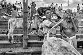 INDIA. Ayodhya. 2010. Worshiping the holy cow on the bank of...