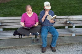 USA. Brooklyn, NY. June 21st, 2017. Readers at Brooklyn Bridge...