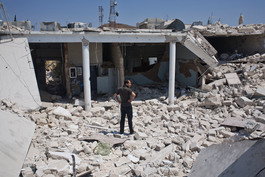 SYRIA, Aleppo, Azaz. 2012. A man stands near his destroyed home,...