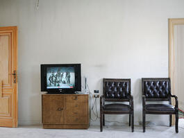 Aleppo, Syria. 2012. An armed child sits on a chair in a small...