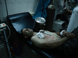 Aleppo, Syria. 2012. A wounded rebel waiting for emergency surgery...