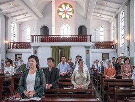 DPR Korea. Pyongyang. 2015. Parishioners at Changchung Roman...