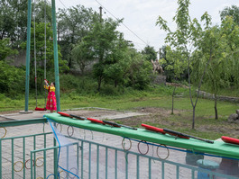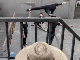 DPR Korea. Pyongyang. 2015. Acrobatic practice on set; Korean...