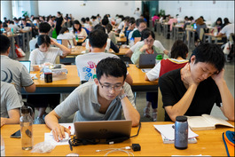 China. Guangdong. Shenzhen. Students sit wherever they can...