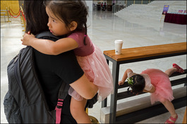 China. Guangdong. Shenzhen. Outside a hotel a mother plays...