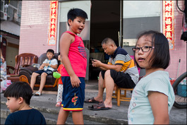 China. Guangdong. Shenzhen. A father points out a photograph...