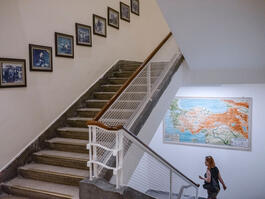 TURKEY. Ankara. 2019. Student look at photos of the university's...