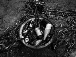 Melted aluminum in a lot of burnt cars on a hill in Bago state...