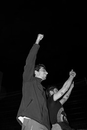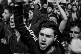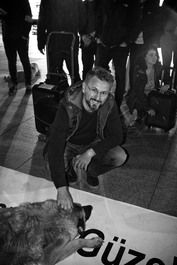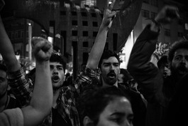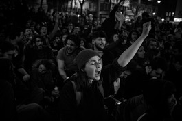 Istanbul, Turkey, 2019. Young man carries a banner written 'there...