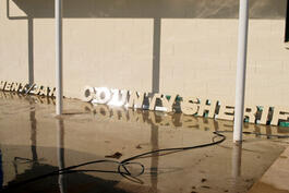 USA. Falfurrias, TX. 2017. Cleaning signs at Brooks County Sheriff...