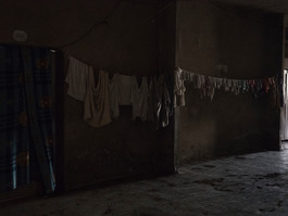 Laundry hangs in the hallway...