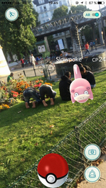 FRANCE, Paris. 2016/08. Pokemon Go with people praying in the...