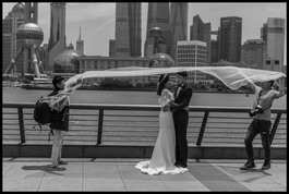 CHINA. Shanghai. Newly wed couple poses for photographs on the...