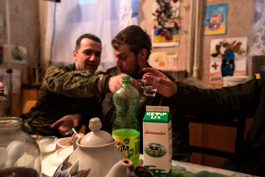 UKRAINE. Artemivsk.2016. Near the frontline. Toasting with vodka....