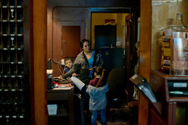 USA. Douglas, AZ. 2016. Receptionist and family at the Gadsden...