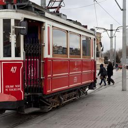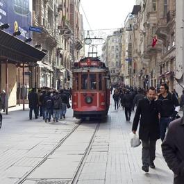 TURKEY. Istanbul. Tram on Istiklal Street leading to Taksim Square....