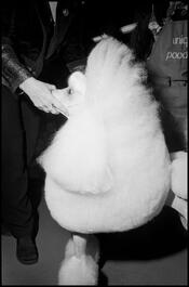 USA. New York City. 2003. A handler holds a poodle's nose and...