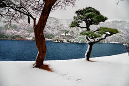 JAPAN. Yokohama. February 2014. A pond bank in the snow in Sankei-en...