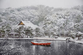 JAPAN. Yokohama. 2014. Sankei-en Garden, a boat covered in snow,...