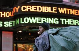 USA. New York City. 2002. Times Square. A "bag person" on the...