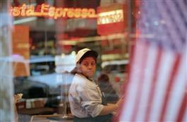 USA. New York City. 2002. Times Square. A waitress in a fast-food...