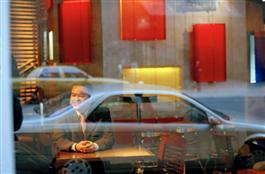 USA. New York City. 2002. Times Square. Rendezvous in a café...