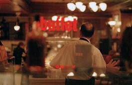 USA. New York City. 2005. Times Square. A waiter in a buffet...
