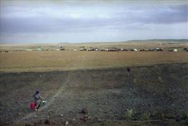 TURKEY. 1990. Bedouin child throwing stones as the bus passes...