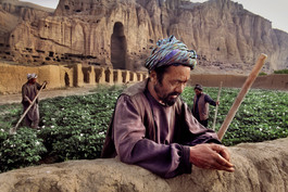 AFGHANISTAN, Hazara, 2006. Men tend to a field near cliffs.