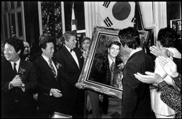USA. 1980. Ronald REAGAN recieving a life-size portrait from...