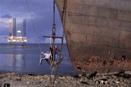 CHILE. Magellan Straits. Punta Arenas, old wreck and ENAP Oil...