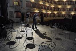 ITALY. Umbria. 2012. Two musicians practice their instruments...
