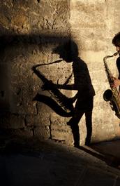 ITALY. Umbria. 2012. Two saxophonists play during a jazz festival....