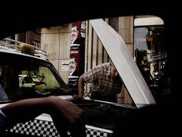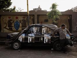 EGYPT. Cairo. 2012. Man standing by a car covered in posters...