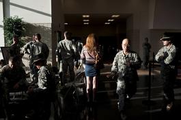 USA. Fort Hood, Texas. 2011. Soldiers and a journalist wait...