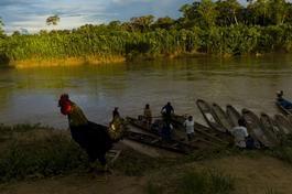 PERU. Atalaya. 2011. Unloading planks (probably cut illegally)....