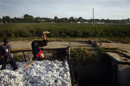 TAJIKISTAN. 2009. Villagers loading a tractor/trailer with cotton...