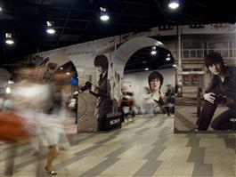 CHINA. 2008. Under all-seeing eyes on a billboard in a Beijing...