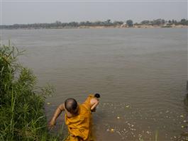 THAILAND. 2008. Monks throw ashes to Mekong as part of ritual...